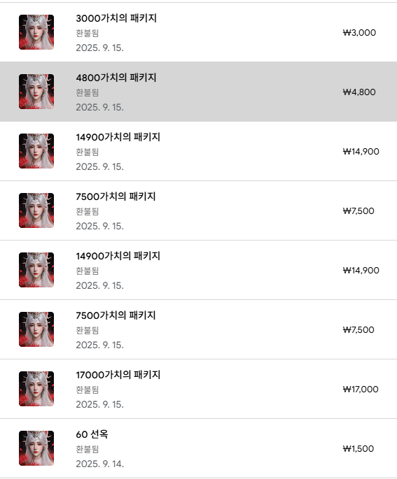게임 아이템이나 패키지를 구글 플레이로 결제한 경우